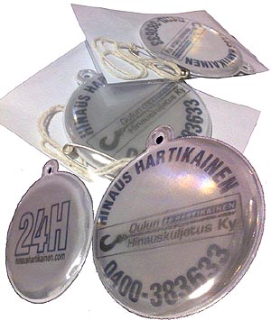 Painatukset voidaan toteuttaa 1-4 värisinä ja kiinnitysvaihtoehtoja on useita. Lisäksi heijastimet voidaan valmistaa täysin asiakkaan toivomaan muotoon painatuksineen.