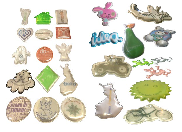 Pehmoheijastimet voidaan valmistaa eri muotoihin. Valikoimissamme on kymmeniä eri mallisia heijastinpohjia.