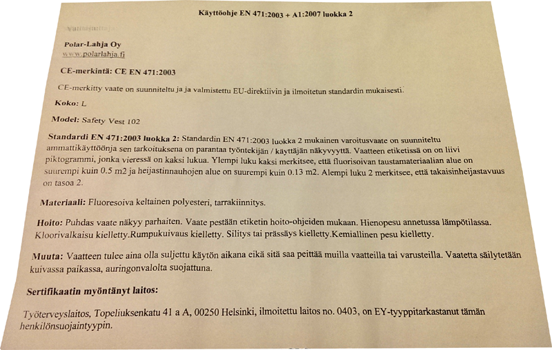 Polar 0010 ja 0012 pakkaukset sisältävät liivien hoito-ohjeet. Huolehdi heijastinliiveistäsi oikein niin ne kestävät pitkään. Klikkaamalla kuvaa näet käyttöohjeet suurempana.